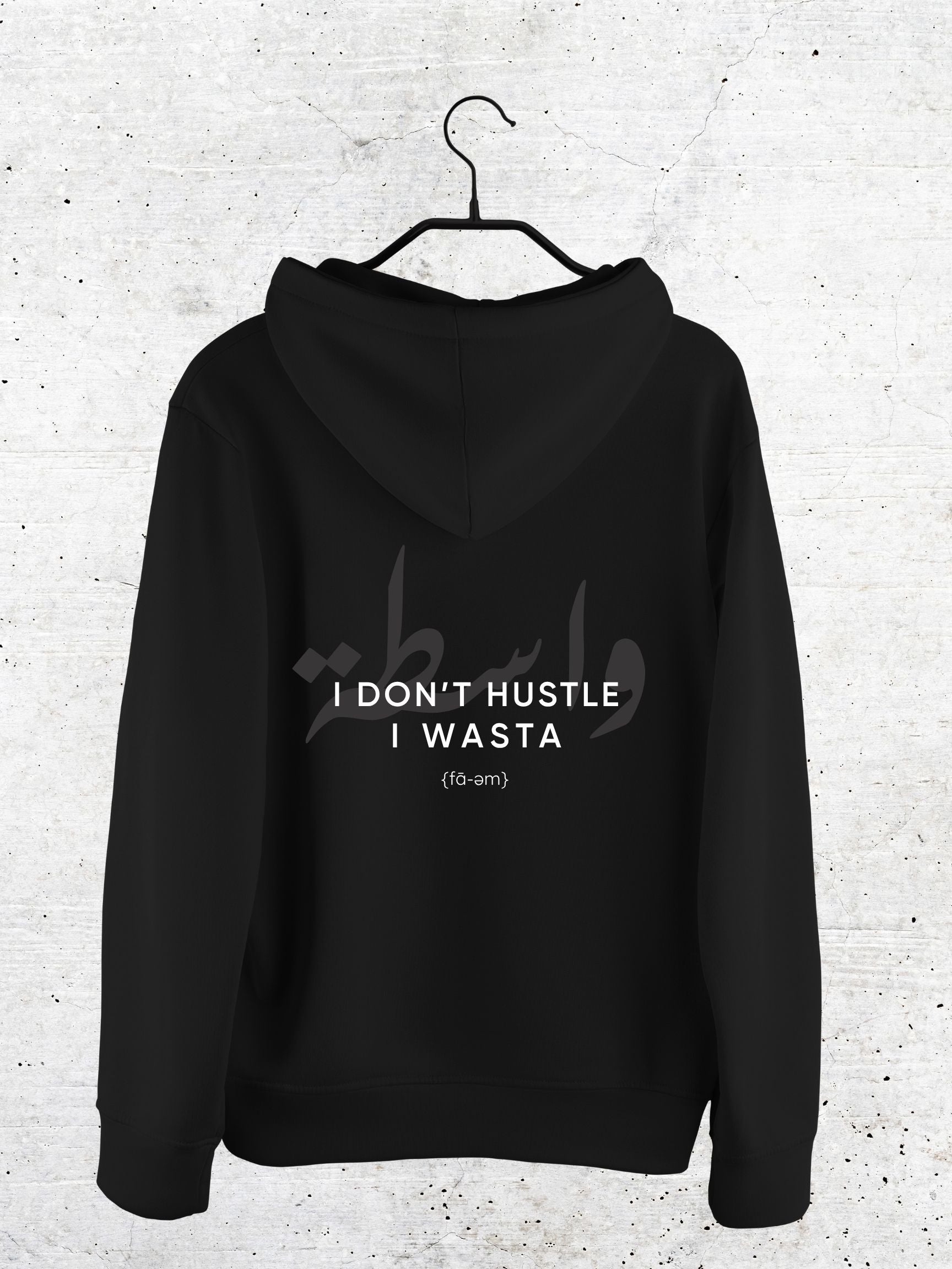 Soft, bold, and built for comfort — this hoodie blends cozy vibes with iconic attitude. Featuring “I Don’t Hustle, I Wasta” on the back and “La Maison de Wasta” on the front, it’s made for those who move through life with confidence (and connections).