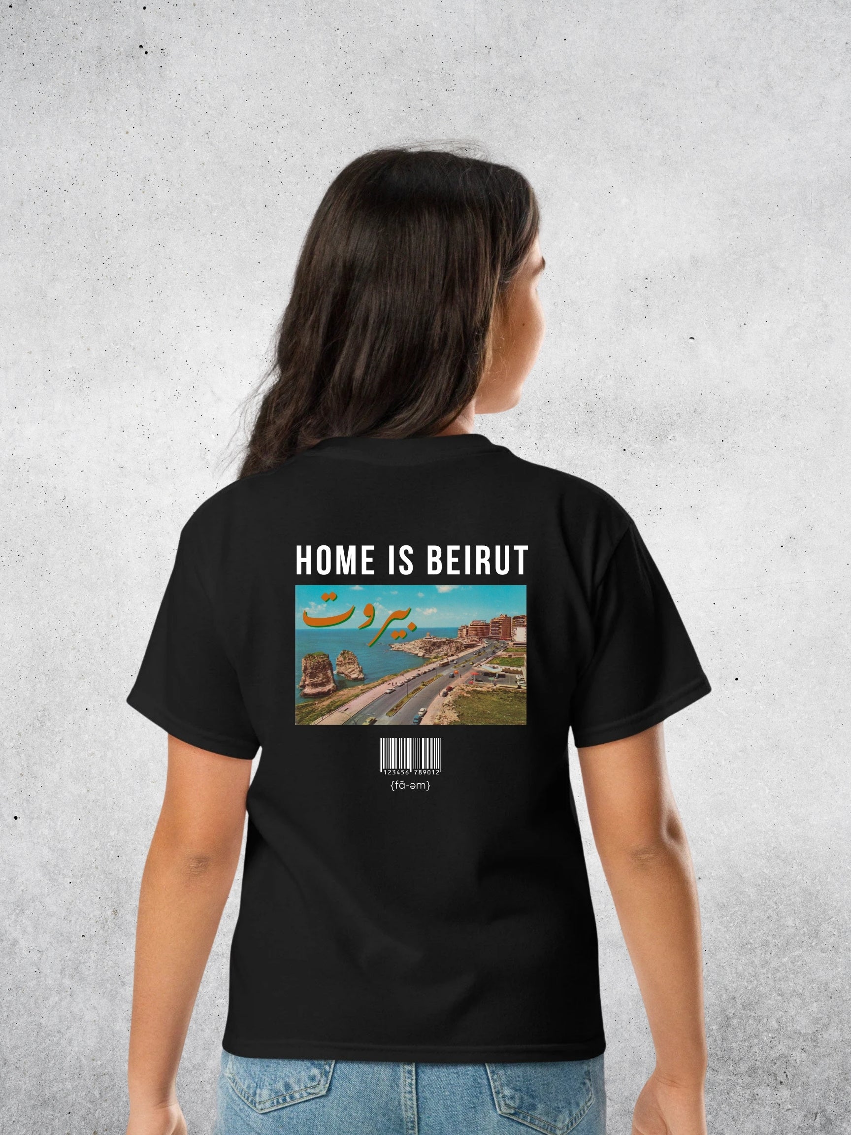 This Fa-em original captures the timeless beauty of the city that never loses its soul, featuring a vintage print of the Beirut coastline and the bold statement “HOME IS BEIRUT”.